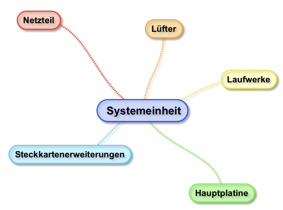 Die Systemeinheit besteht aus einzelnen Komponenten. Die Komponenten können durch Ihren modularen Aufbau einfach zusammengebaut und erweitert werden. Des weiteren gibt es die Peripherie.