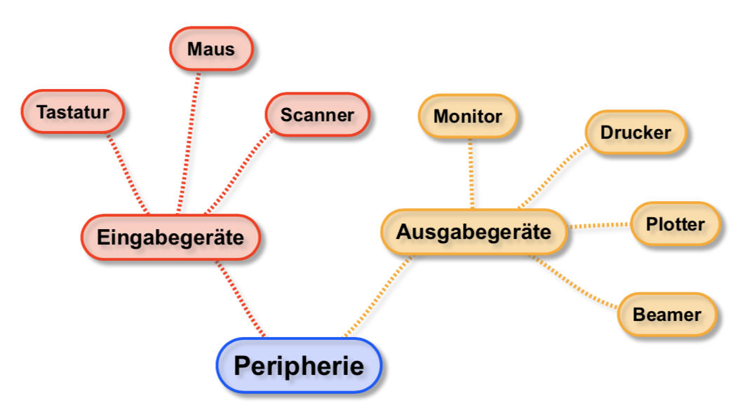 Alle Komponenten die zwischen PC und PC oder Anwender und PC agieren, werden als Peripherie berzeichnet. Die Peripheriegeräte werden in Eingabe und Ausgabegeräte untergliedert.